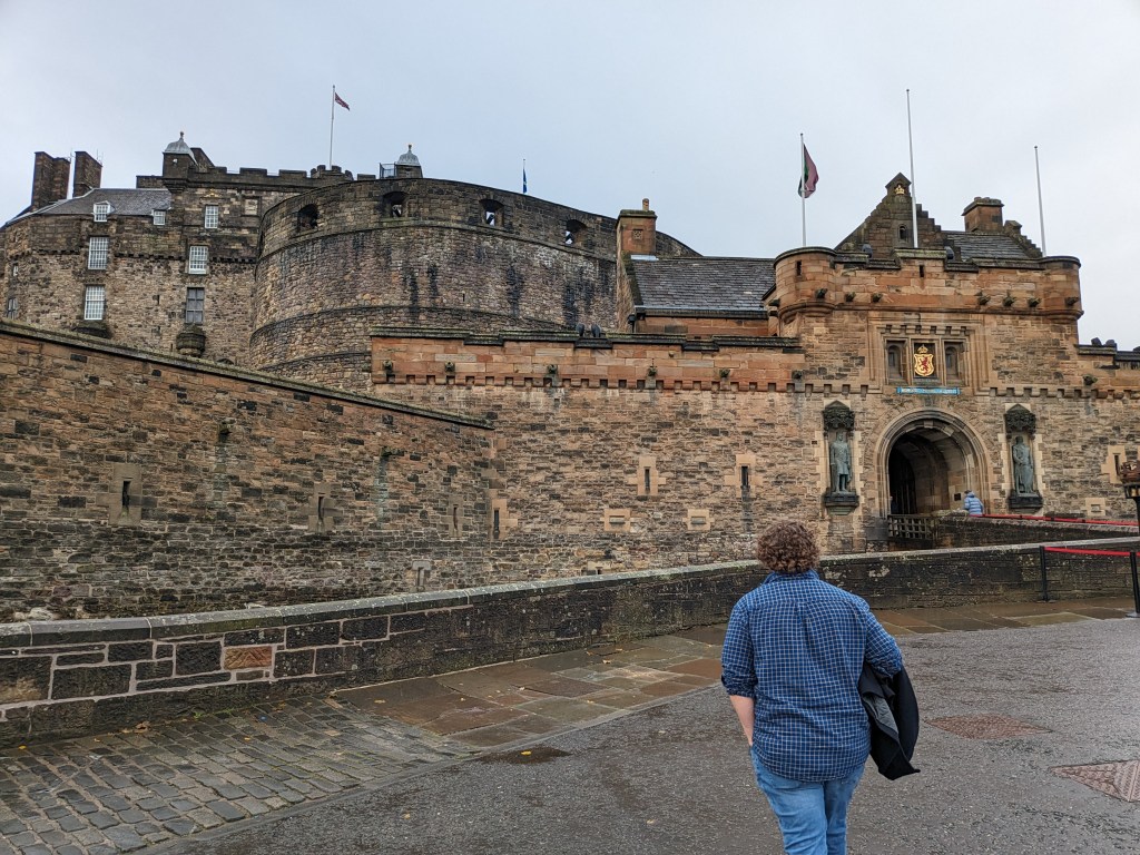 Today we started with a walk to Rose Street Cafe which is a small, diner style place. It was completely packed and cozy. I got pancakes, bacon, and hashbrowns. Very yummy! They had an “American style” breakfast on the menu that was something sad and simple like scrambled eggs and toast and made us all giggle. After breakfast we split our separate ways. Mom went to a local church that was having a craft fair while Scott and I headed up to Edinburgh Castle. And I say up because you literally have to climb up through the winding streets to get to it because it is on a massive hill. The views from the top of the castle are absolutely breathtaking. We were even able to see the house we are staying in from there.