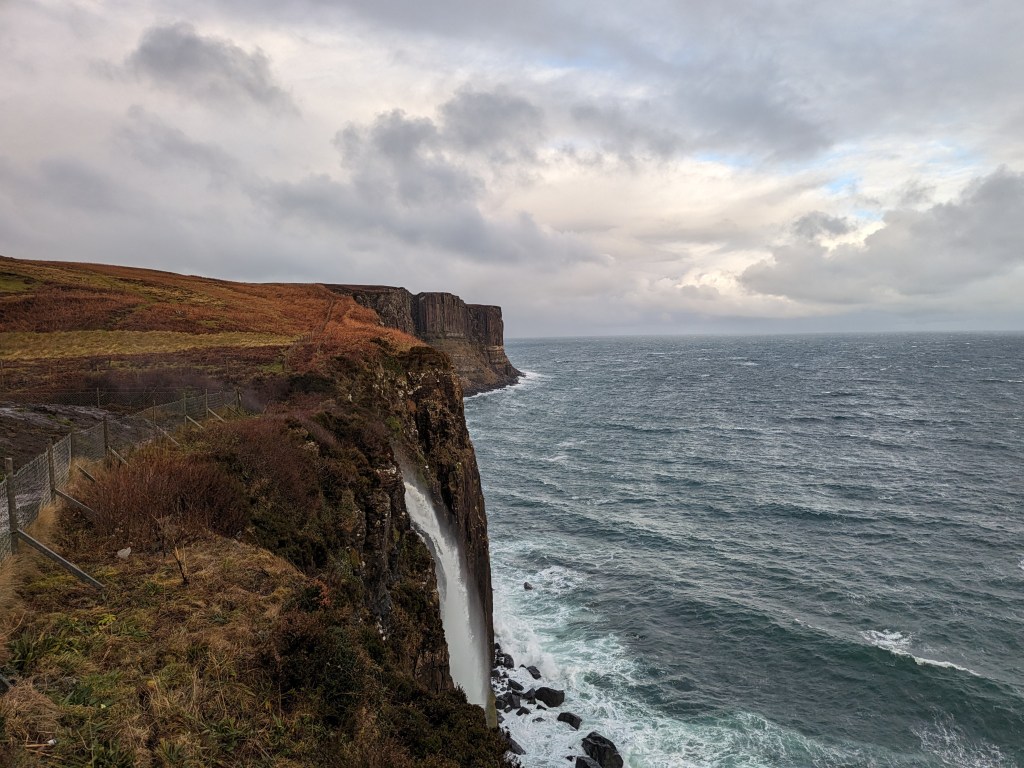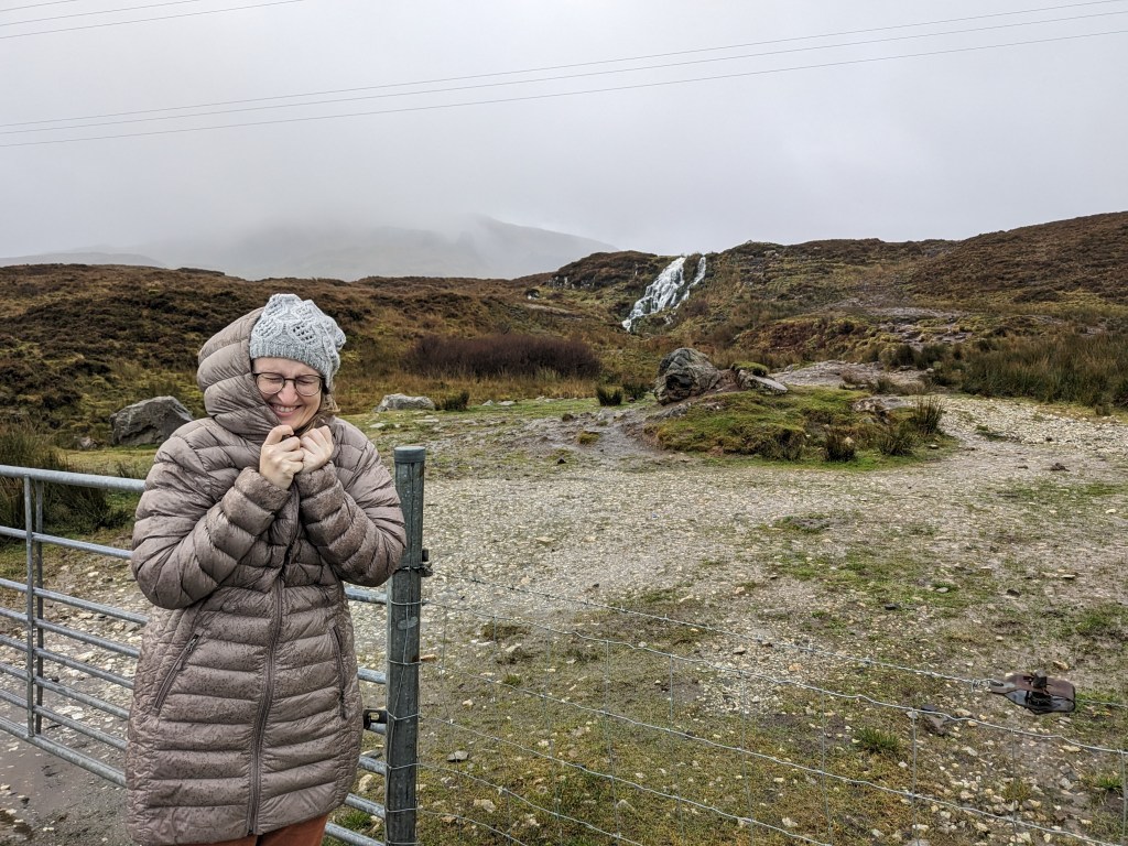 Today we woke up in our cozy, tiny homes and had a hearty breakfast at our hotel. I had eggs benedict but with local smoked Scottish salmon instead of ham. It was delicious and so fresh. Today our agenda included a scenic drive around the island to take in as much of the scenic landscape as possible. We saw some beautiful scenery on our drive to the island yesterday, but the more we drove around the island the more beauty we beheld. There are a wide variety of stops you can make on this scenic loop which mostly takes you around the major highway on the island. We picked out the ones we wanted ahead of time and used Google maps to plan it all out in order. Our first stop was Brides Veil Falls. For the most part we have had mild weather in Scotland so far. It’s very cold and gray and mists rain from time to time but nothing too bad. Today however, Skye showed us some of the famous Scottish unpredictability. You can see on my face in this picture that the wind was intense and also dumping rain directly in my face which is horribly cold. We still did enjoy this waterfall though.