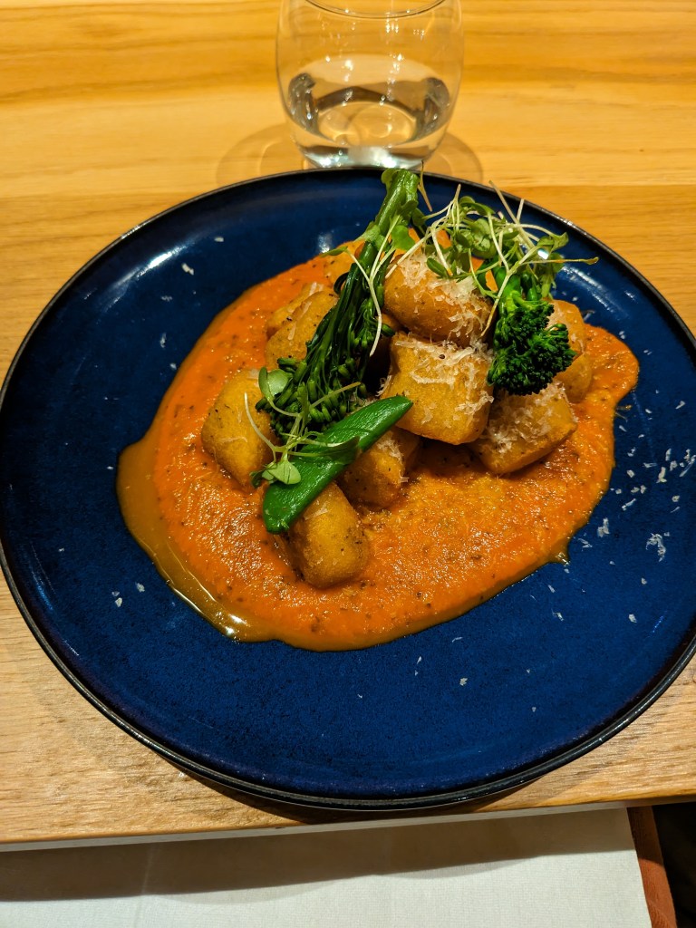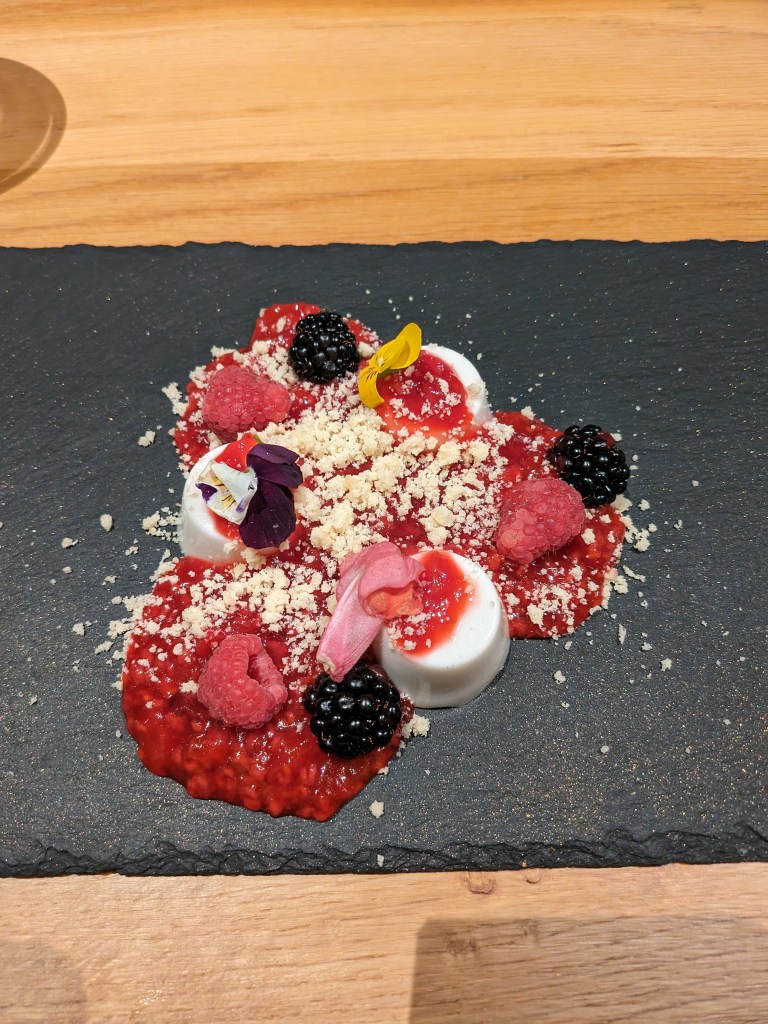 We went to the hotel bar before dinner for a drink and I had a nice locally brewed Skye beer. The ingredients listed Fairy Glen water as an ingredient which is where we were earlier so that felt extra special. For dinner we stayed at the hotel restaurant, Frasers. We just couldn’t imagine eating anywhere else when the food is so amazing. Scott and I shared the smoked scallops for an appetizer. I did not get a picture but the dish was served under a cloche with the delicious smoke trapped underneath. They reveal the scallops at the table. For the main course, I had crispy gnocchi that were like delicious little pillows on top of fresh tomato sauce with green veggies. I finished off the meal with the panna cotta with red fruit sauce. So yummy and light. A perfect way to end our final night in Skye.
