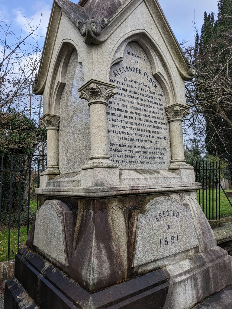After a long drive we finally reached Cumnock to visit an old cemetery. If you have kept up with the blog you will remember a mask we saw in the National Museum in Edinburgh of Alexander Peden. He is supposedly my ancestor. We believe we are descended from his siblings or other relatives that lived in the area at that time. Whether we are related or not, he has still been fascinating to learn about and he is from the same area as my family. He was a rebel Presbyterian preacher who refused to bow down to England’s forced religious reformation. He was a hunted man and was caught twice but managed to escape. His death is very interesting as well. Despite being hunted for most of his adult life, he died of natural causes at age 60 in 1686. He was buried by his family. The English found out he had died and were so enraged that they dug him up and were going to hang his body at the gallows on display. A local Earl objected to this so they instead buried him at the foot of the gallows. Later in 1891 a memorial was built here and a cemetery started around his grave by local people.